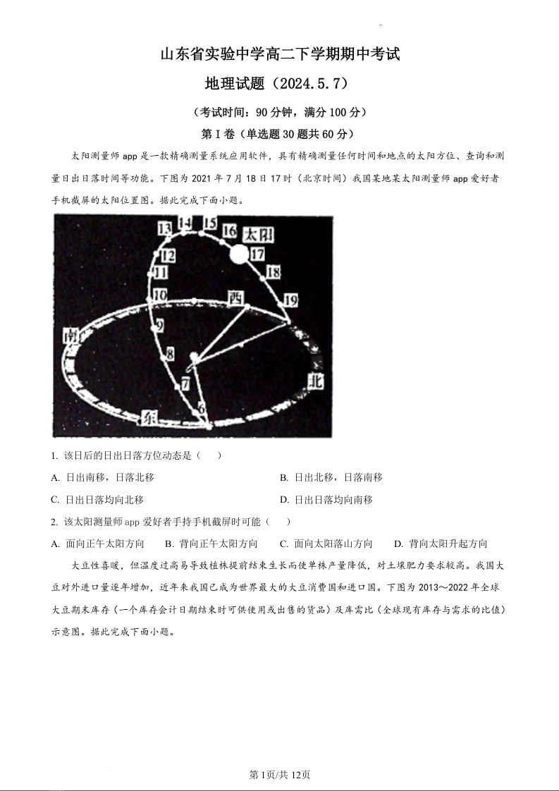 山东省济南市省实验中学2023-2024学年高二下学期5月期中考试地理(原卷版)