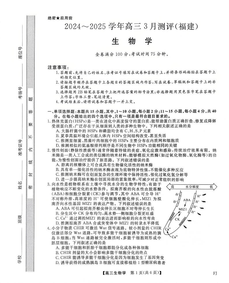 福建省部分地市校2025届高中毕业班3月质量检测生物