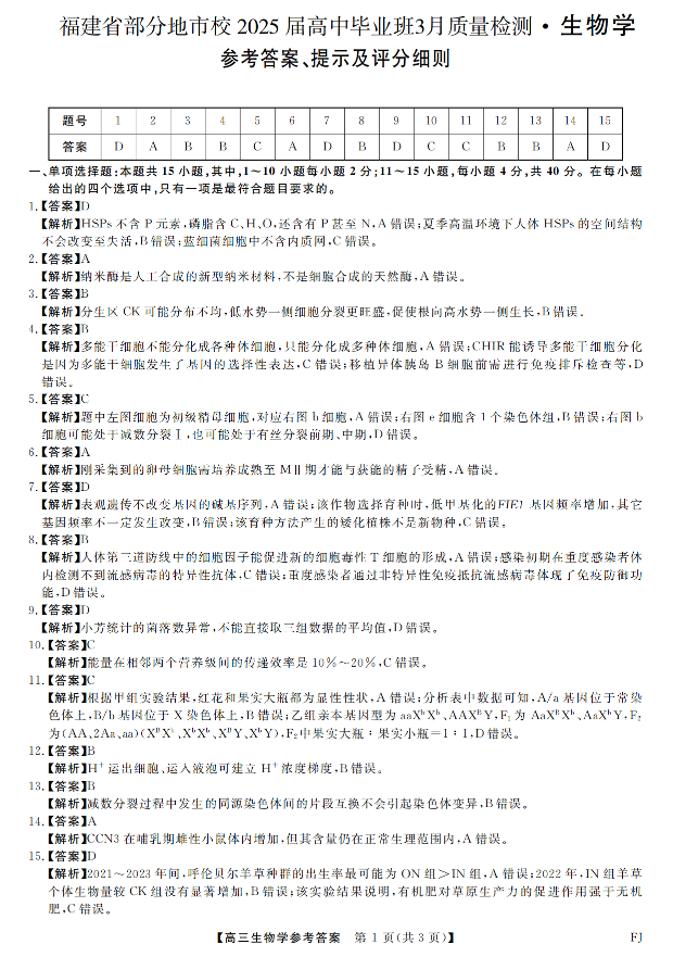 福建省部分地市校2025届高中毕业班3月质量检测生物答案