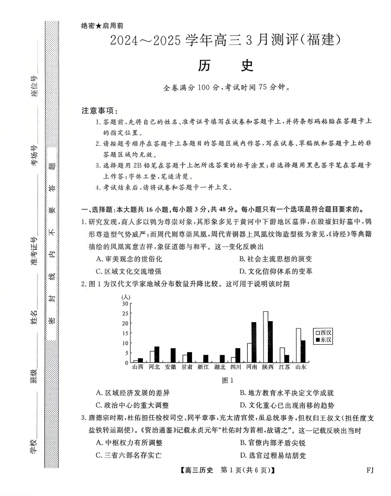 福建省部分地市校2025届高中毕业班3月质量检测历史