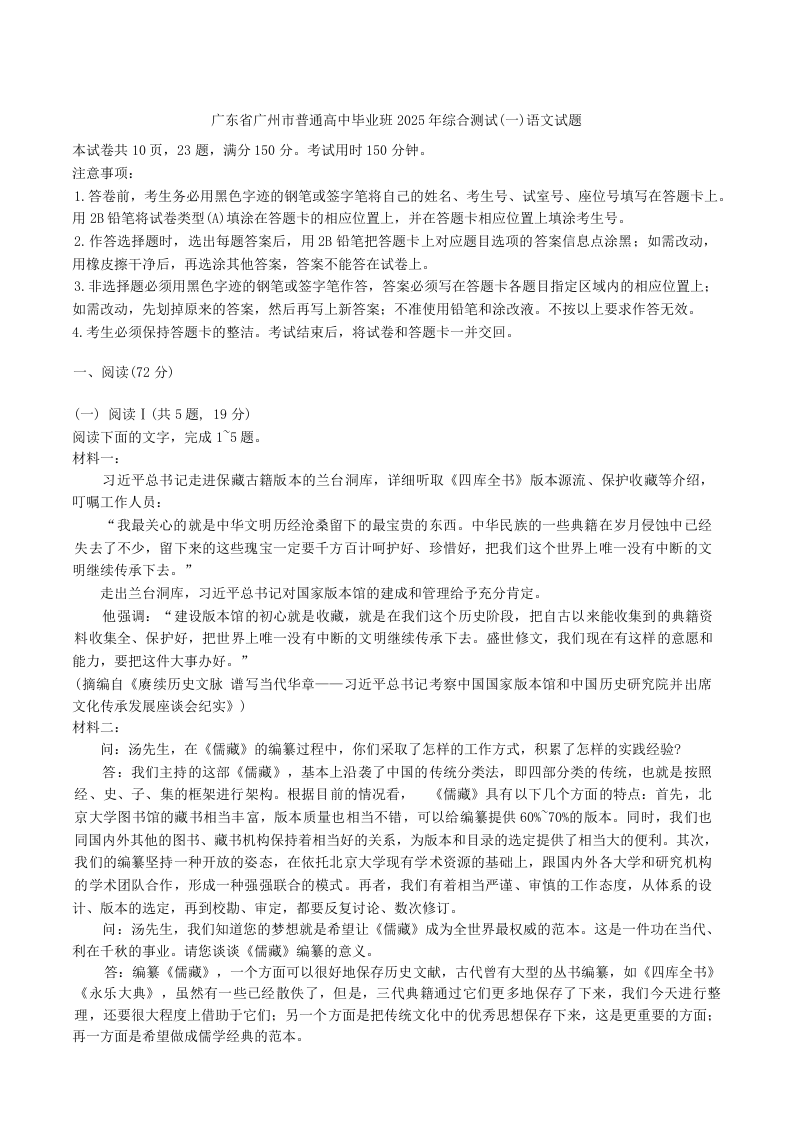 广东省广州市2025届高三普通高中毕业班综合测试(一)(广州一模)语文+答案