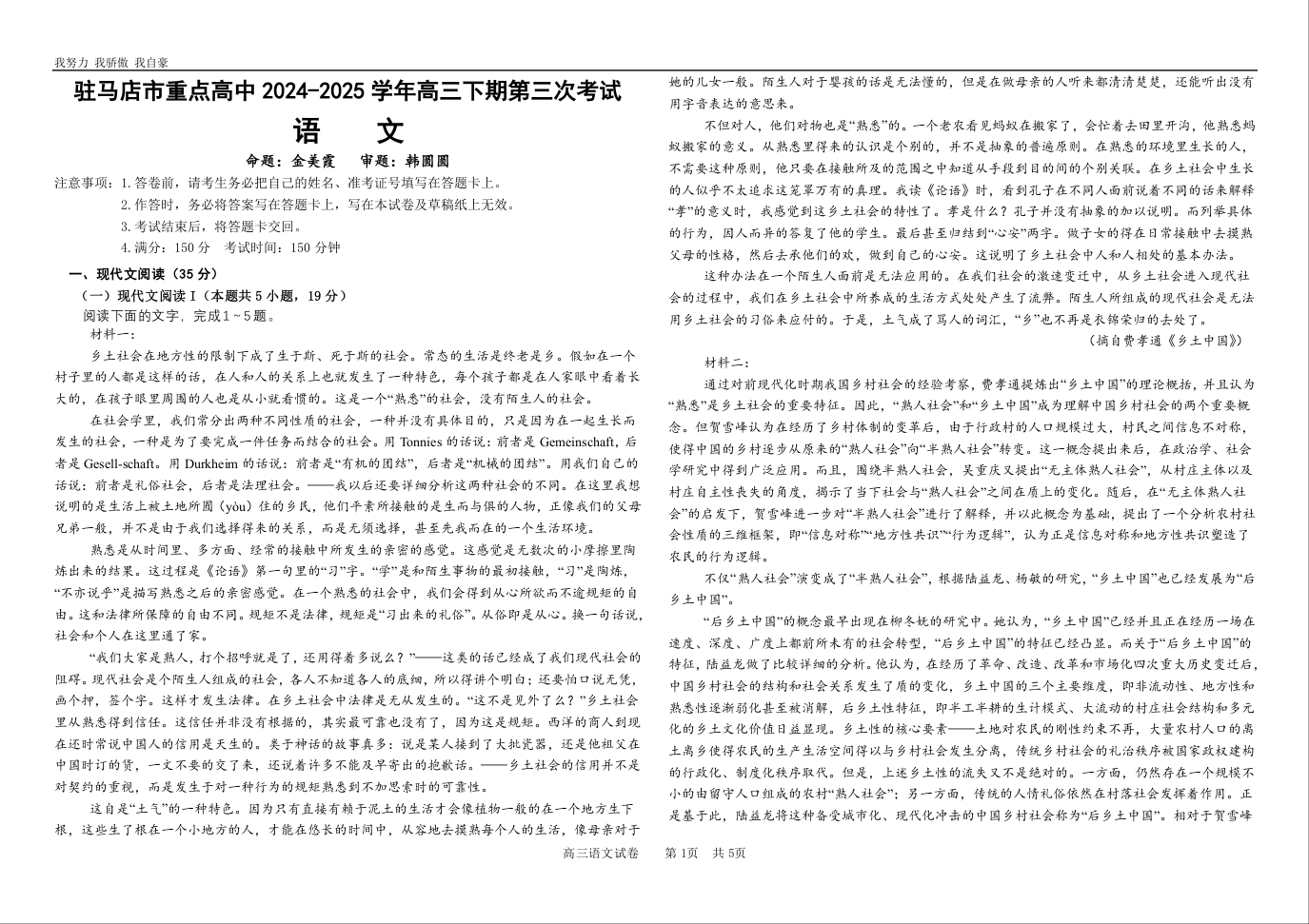 河南省驻马店市重点高中2025届高三下期第三次考试语文