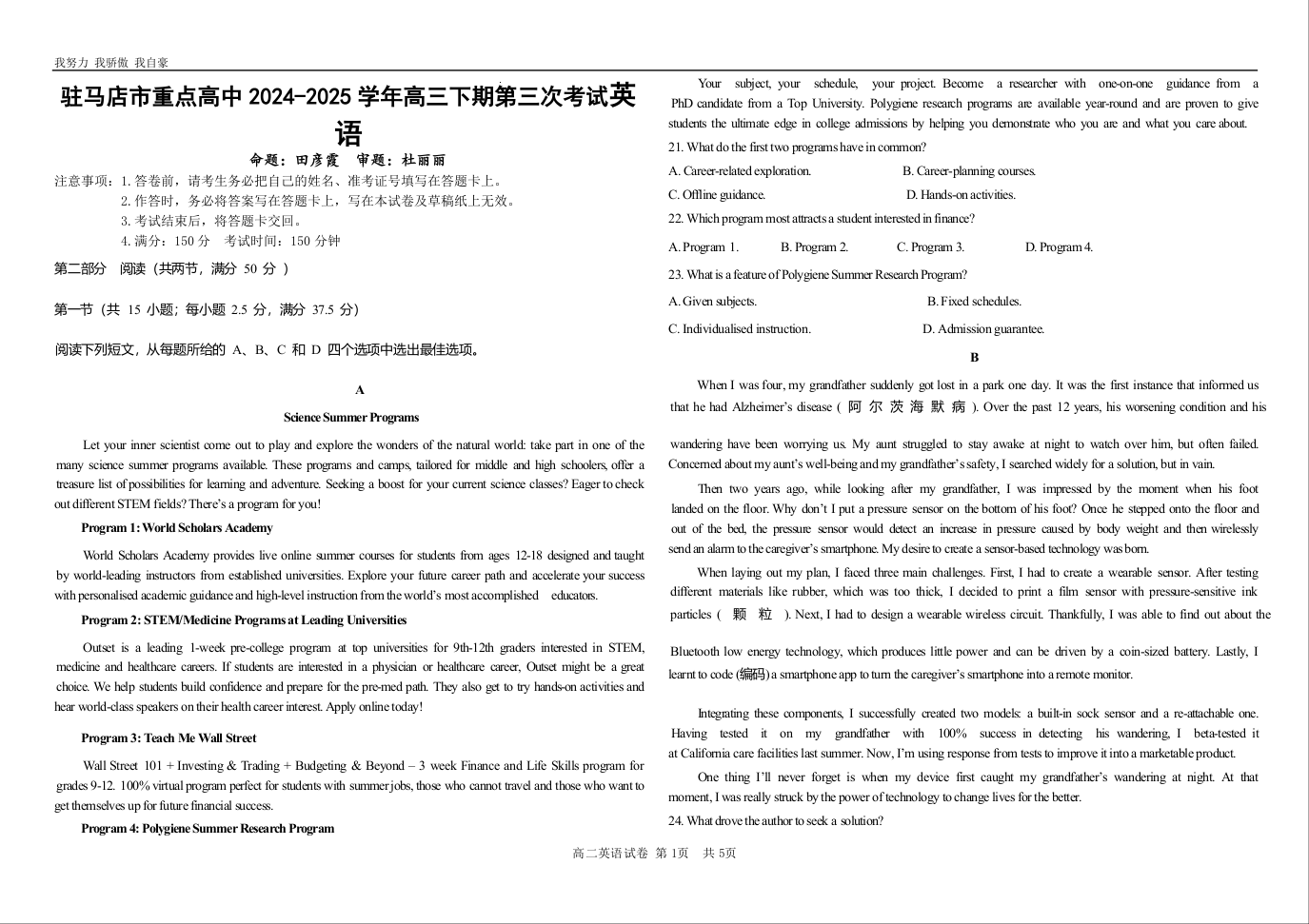 河南省驻马店市重点高中2025届高三下期第三次考试英语