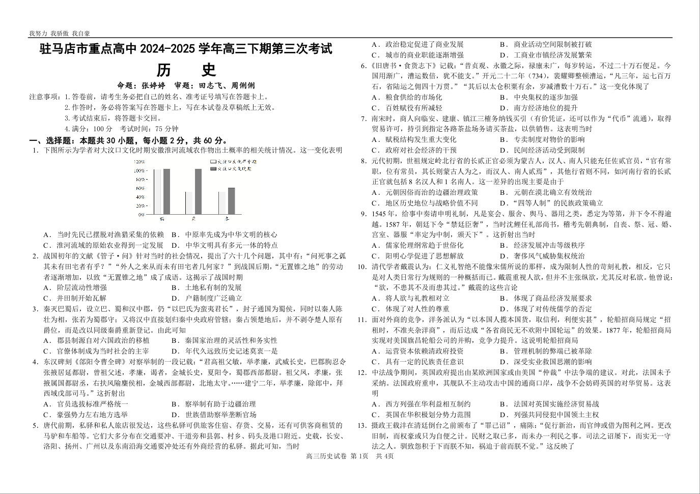 河南省驻马店市重点高中2025届高三下期第三次考试历史