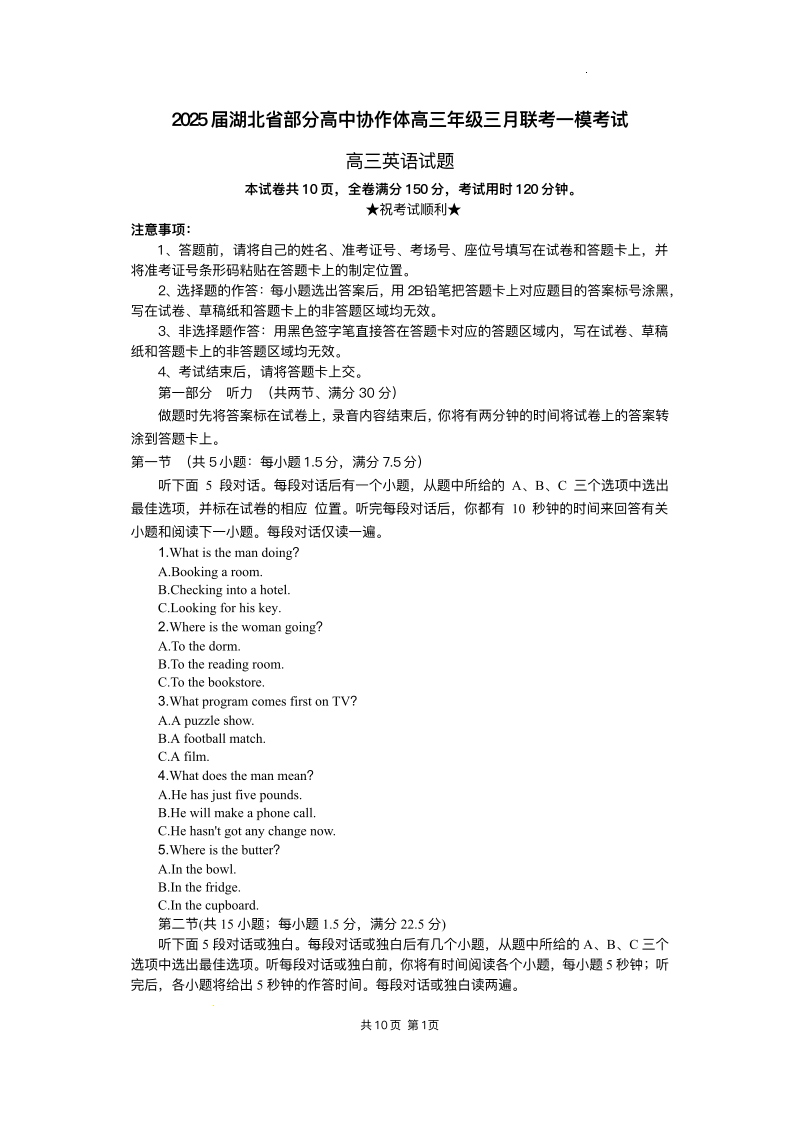 湖北省部分高中协作体2025届高三下学期3月一模联考英语+答案