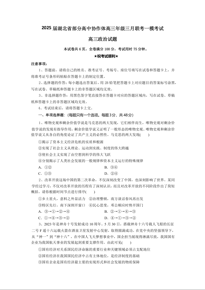 湖北省部分高中协作体2025届高三下学期3月一模联考政治