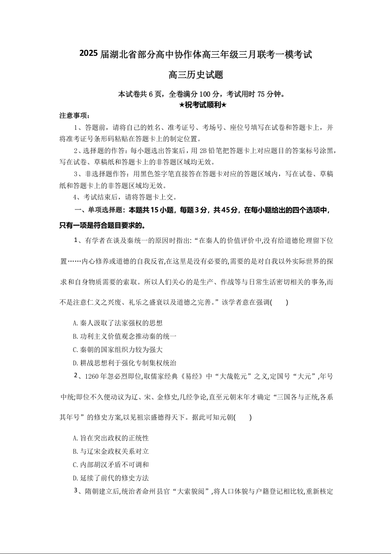 湖北省部分高中协作体2025届高三下学期3月一模联考历史