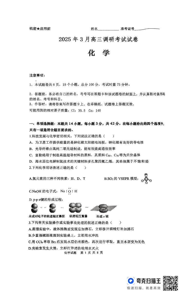 湖南省“长望浏宁”四县联考2025届高三下学期3月调研考试化学