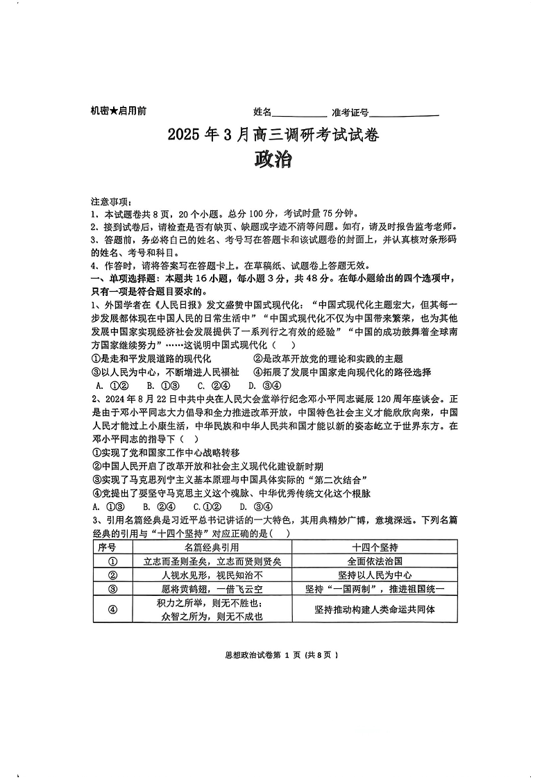 湖南省“长望浏宁”四县联考2025届高三下学期3月调研考试政治+答案