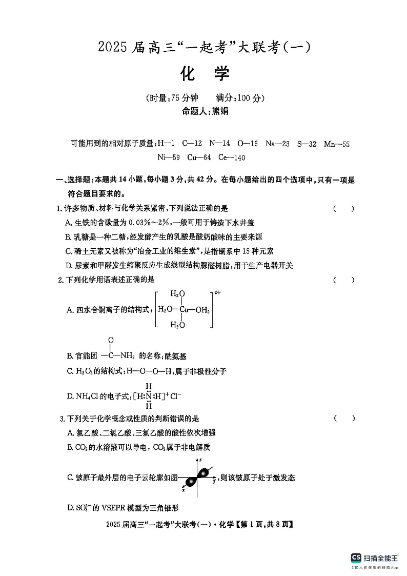 湖南省2025届高三下学期“一起考”大联考(一模)化学