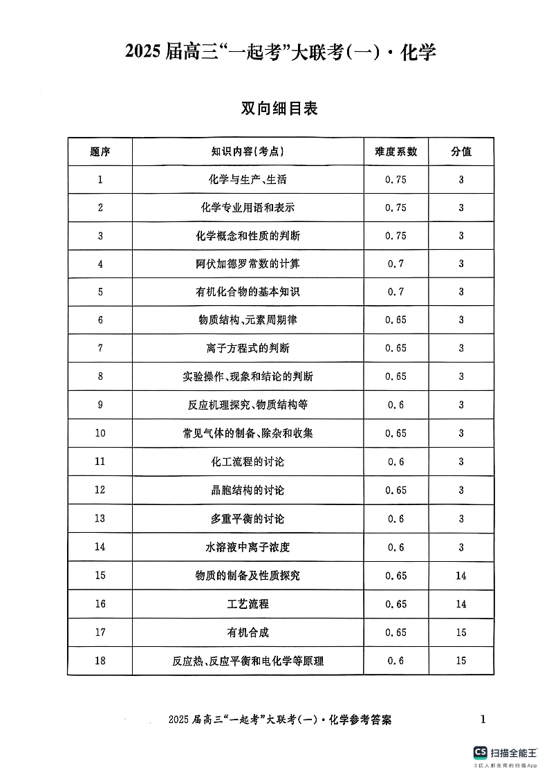 湖南省2025届高三下学期“一起考”大联考(一模)化学答案