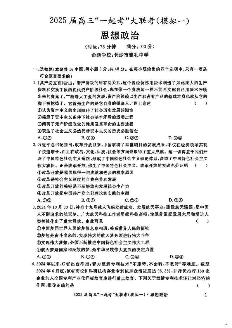 湖南省2025届高三下学期“一起考”大联考(一模)政治+答案