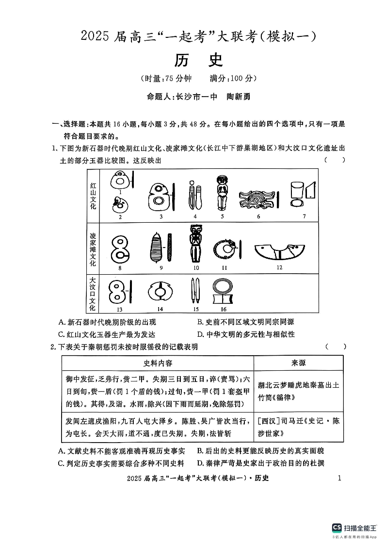 湖南省2025届高三下学期“一起考”大联考(一模)历史