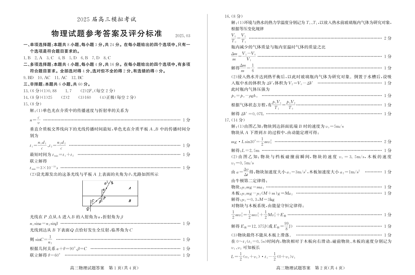 山东省枣庄市2025届高三模拟考试(枣庄二调)物理答案
