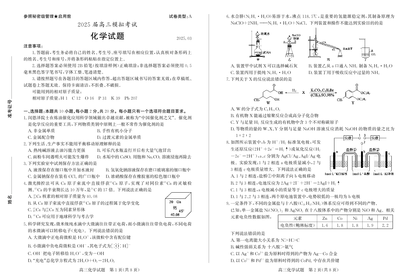 山东省枣庄市2025届高三模拟考试(枣庄二调)化学