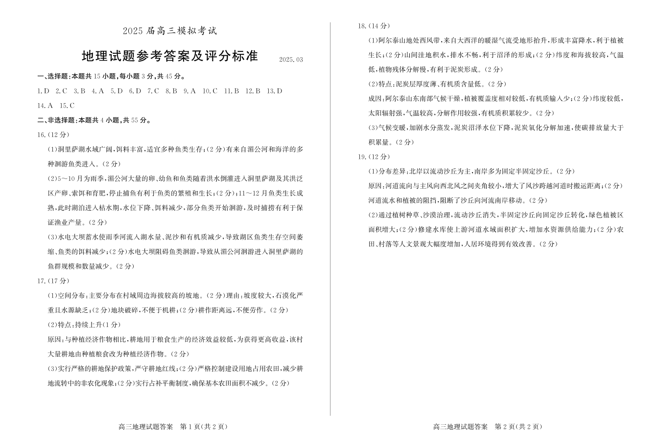 山东省枣庄市2025届高三模拟考试(枣庄二调)地理答案