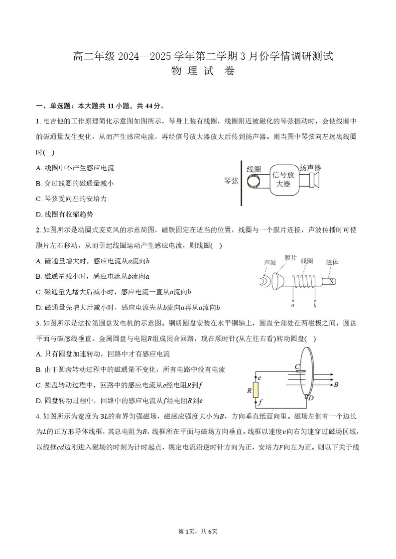 江苏省连云港市区域2024-2025学年下学期3月高二考试物理