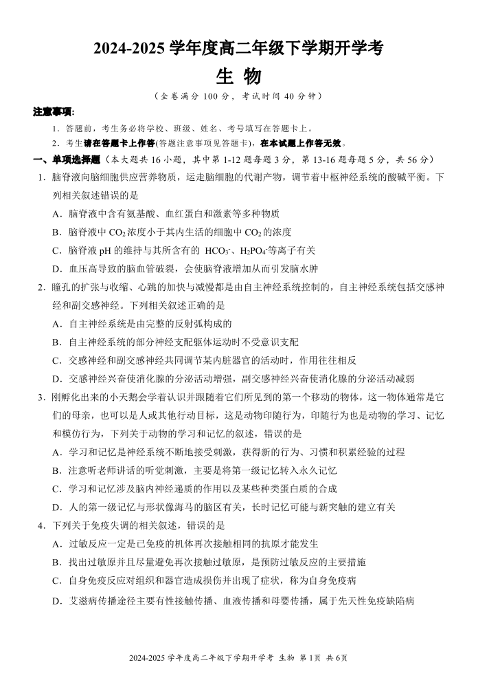 广西梧州市2024-2025学年下学期高二开学考试生物+答案