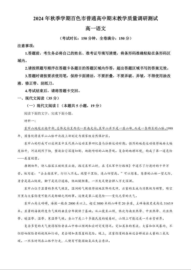 广西壮族自治区百色市2024-2025学年上学期1月高一期末考试语文(原卷版)