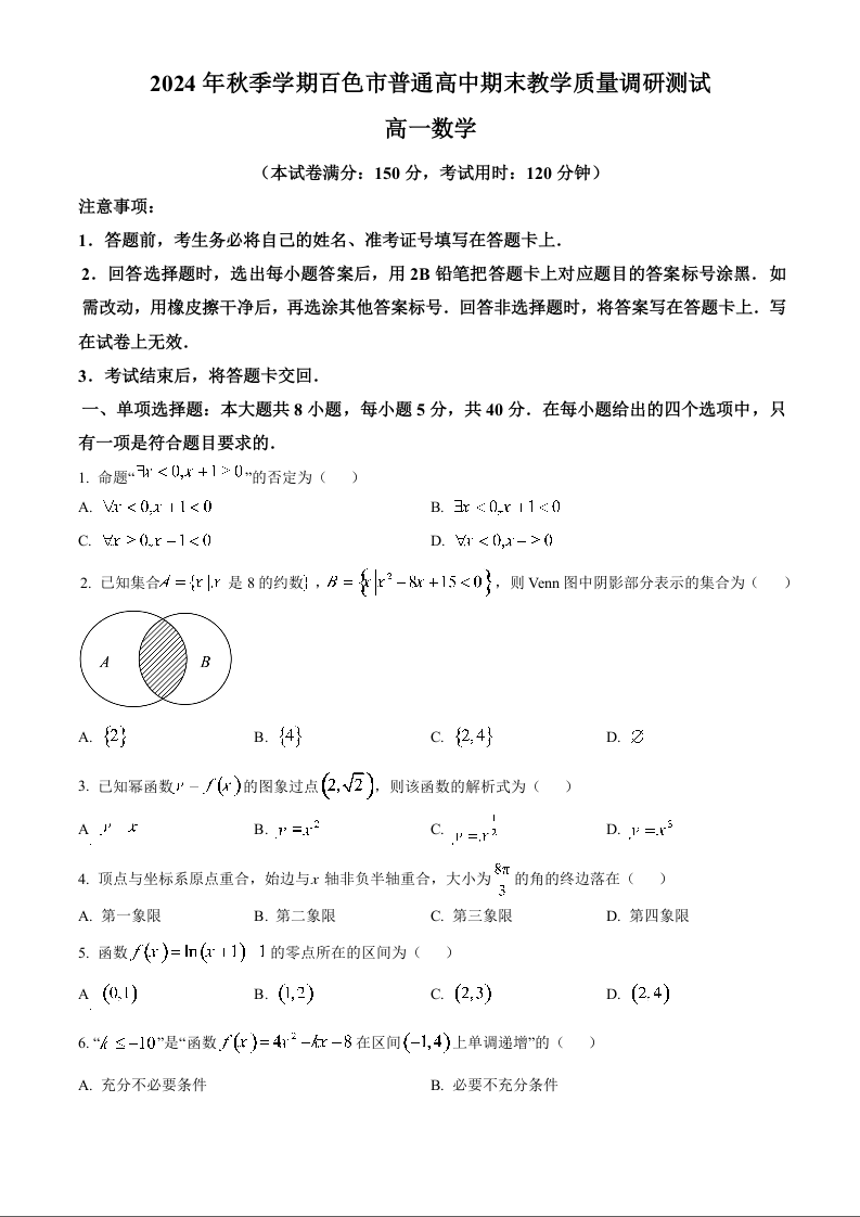 广西壮族自治区百色市2024-2025学年上学期1月高一期末考试数学(原卷版)