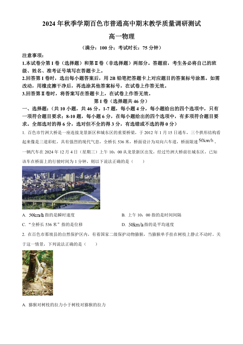 广西壮族自治区百色市2024-2025学年上学期1月高一期末考试物理(原卷版)