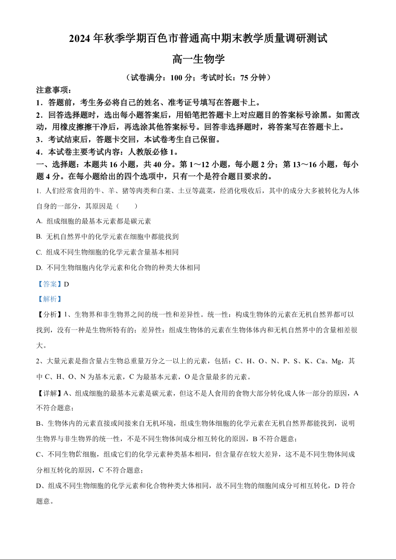广西壮族自治区百色市2024-2025学年上学期1月高一期末考试生物(解析版)