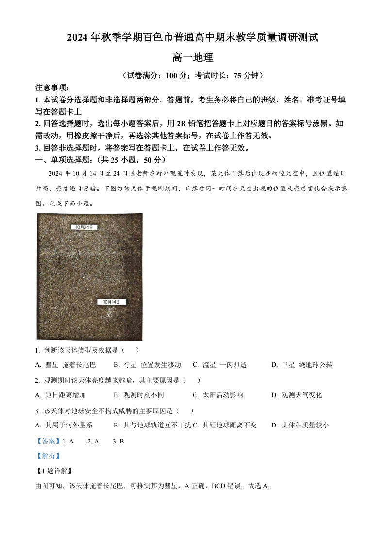 广西壮族自治区百色市2024-2025学年上学期1月高一期末考试地理(解析版)
