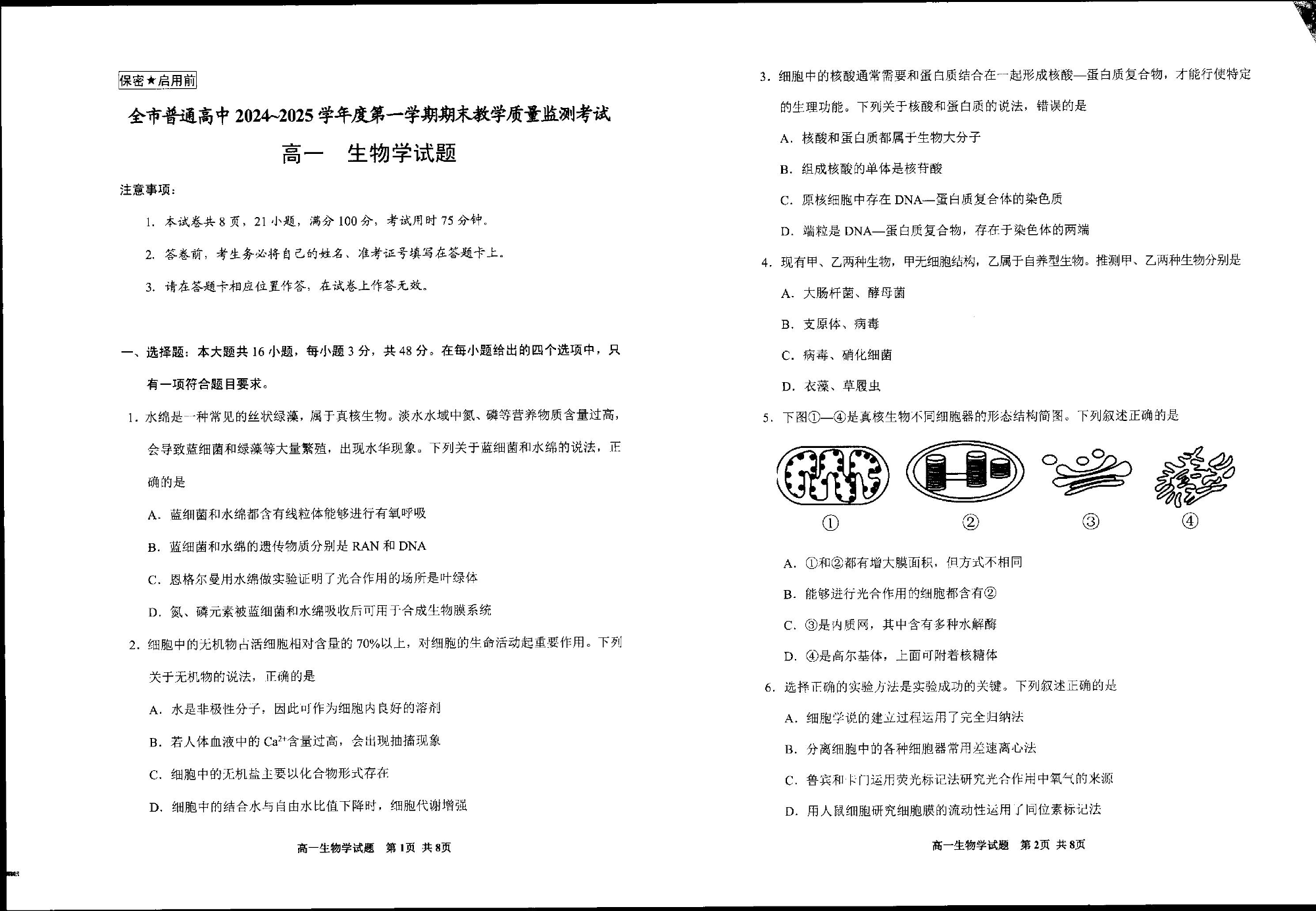 贵州省安顺市2024-2025学年上学期1月高一期末考试生物