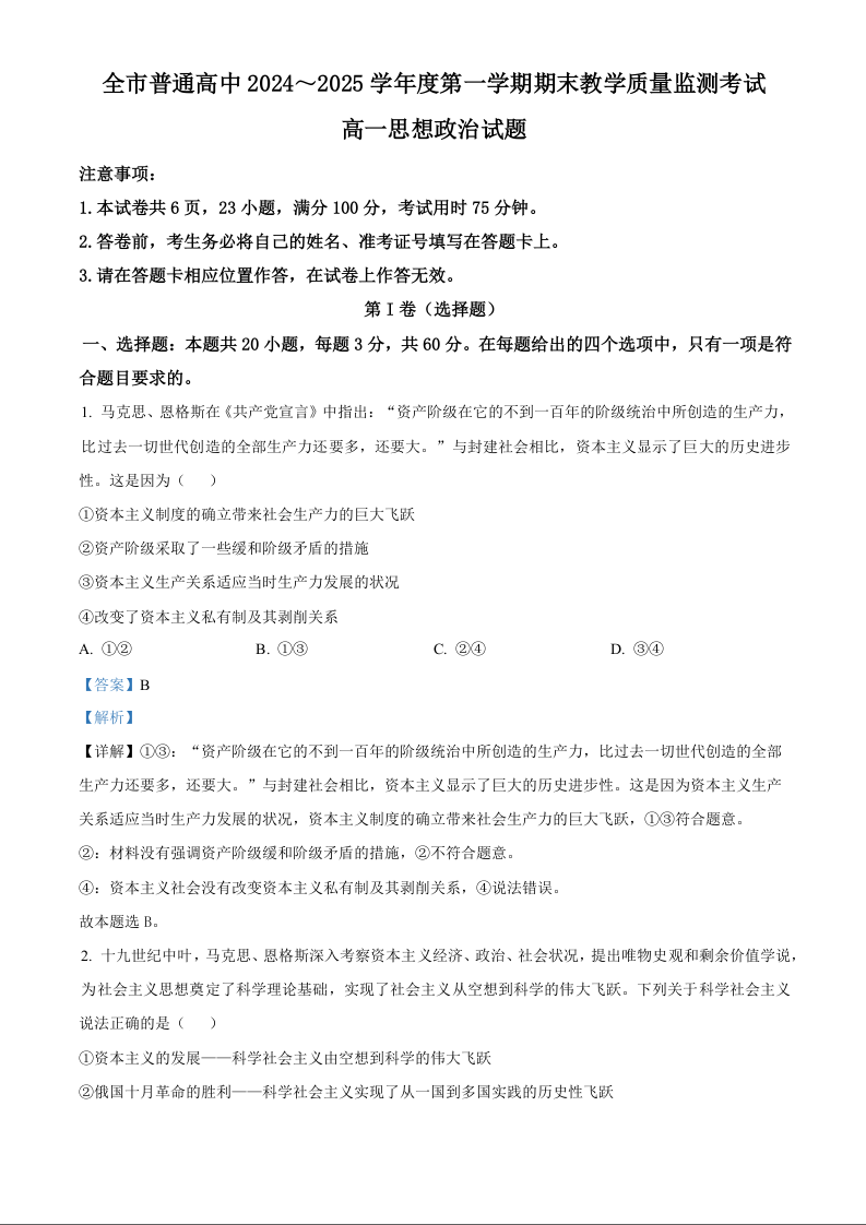 贵州省安顺市2024-2025学年上学期1月高一期末考试政治(解析版)
