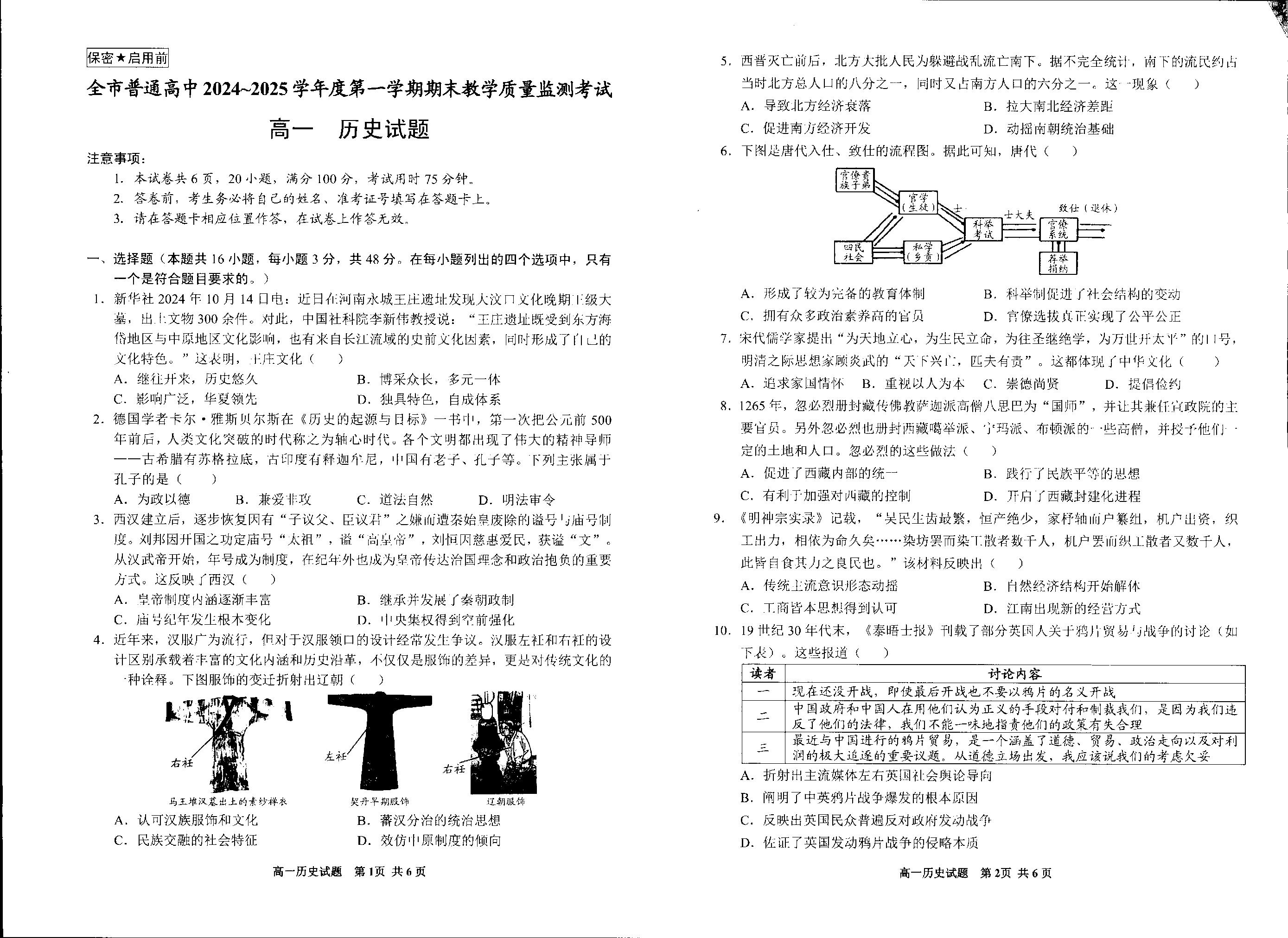 贵州省安顺市2024-2025学年上学期1月高一期末考试历史+答案