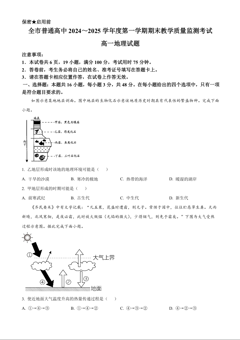 贵州省安顺市2024-2025学年上学期1月高一期末考试地理(原卷版)