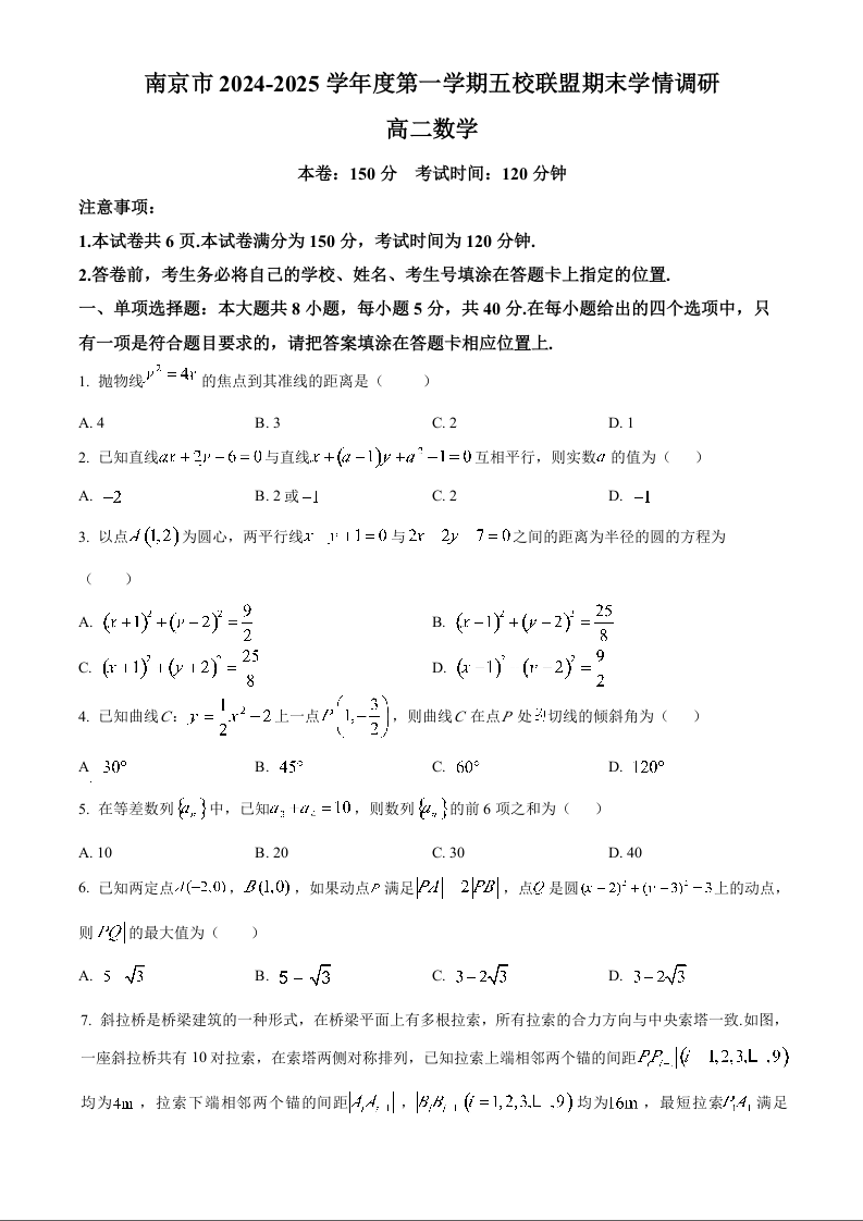 江苏省南京市五校联盟2024-2025学年上学期1月高二期末考试数学(原卷版)