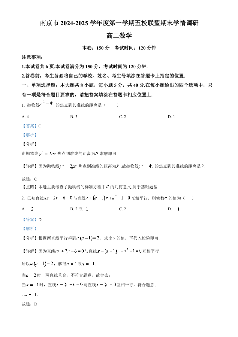江苏省南京市五校联盟2024-2025学年上学期1月高二期末考试数学(解析版)