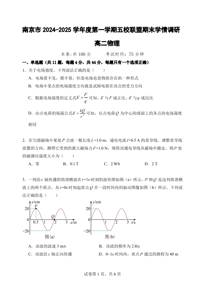 江苏省南京市五校联盟2024-2025学年上学期1月高二期末考试物理+答案