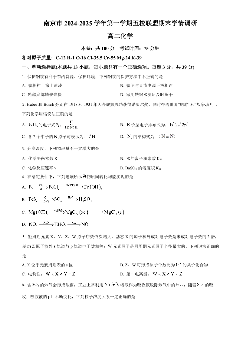 江苏省南京市五校联盟2024-2025学年上学期1月高二期末考试化学(原卷版)