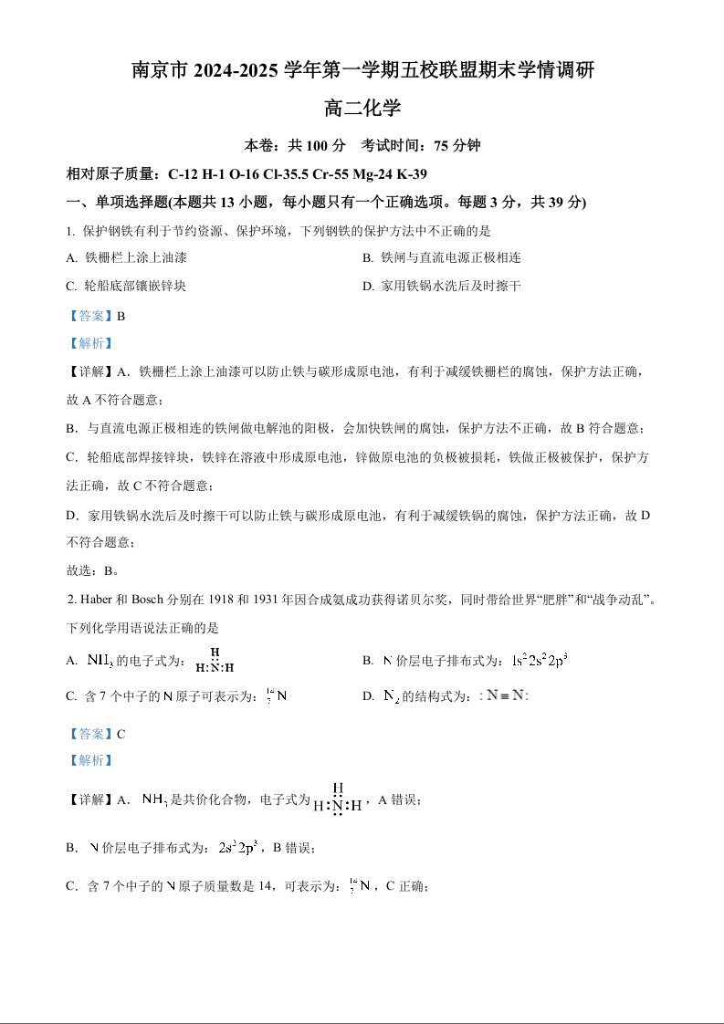 江苏省南京市五校联盟2024-2025学年上学期1月高二期末考试化学(解析版)