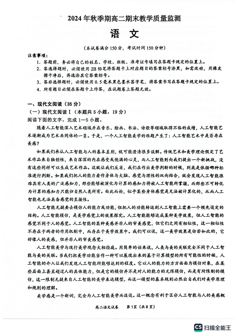 广西玉林市2024-2025学年高二上学期期末教学质量监测语文+答案