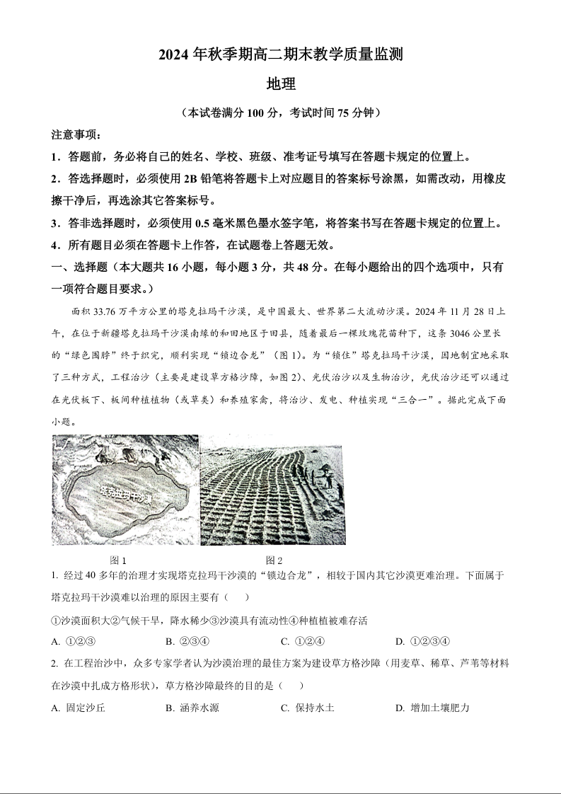 广西玉林市2024-2025学年高二上学期期末教学质量监测地理+答案