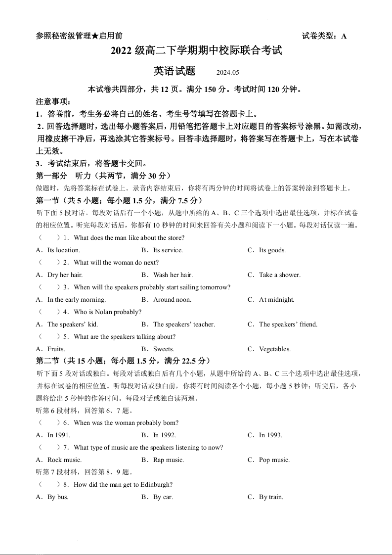 山东省日照市2023-2024学年高二下学期期中考试英语+答案