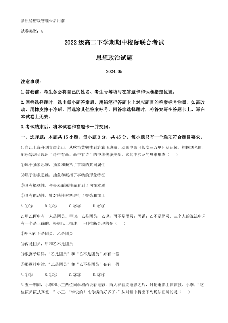 山东省日照市2023-2024学年高二下学期期中考试政治
