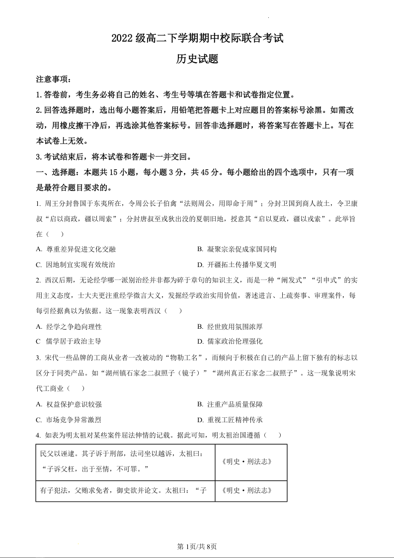 山东省日照市2023-2024学年高二下学期期中考试历史(原卷版)