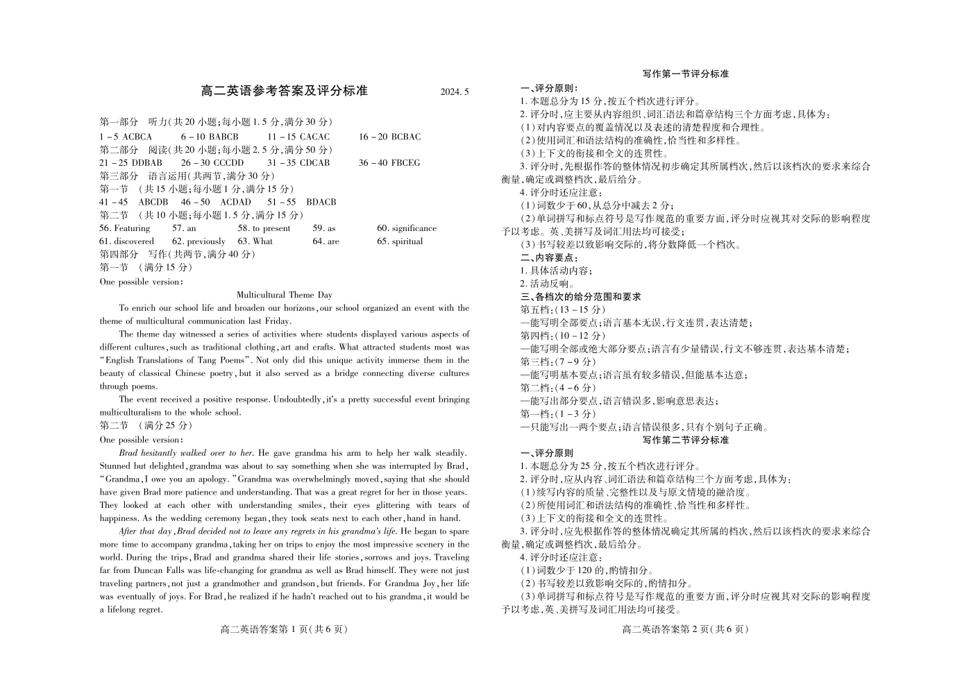 山东省潍坊市2023-2024学年高二下学期期中考试英语答案