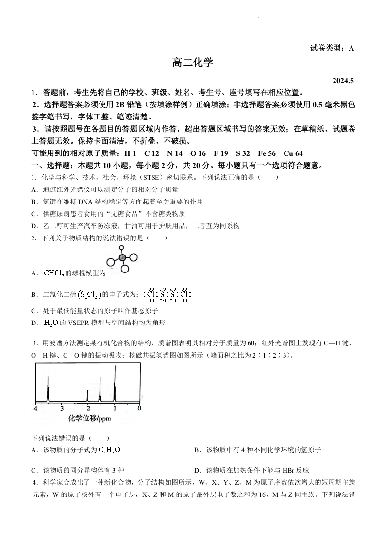 山东省潍坊市2023-2024学年高二下学期期中考试化学