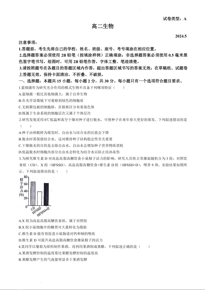山东省潍坊市2023-2024学年高二下学期期中考试生物