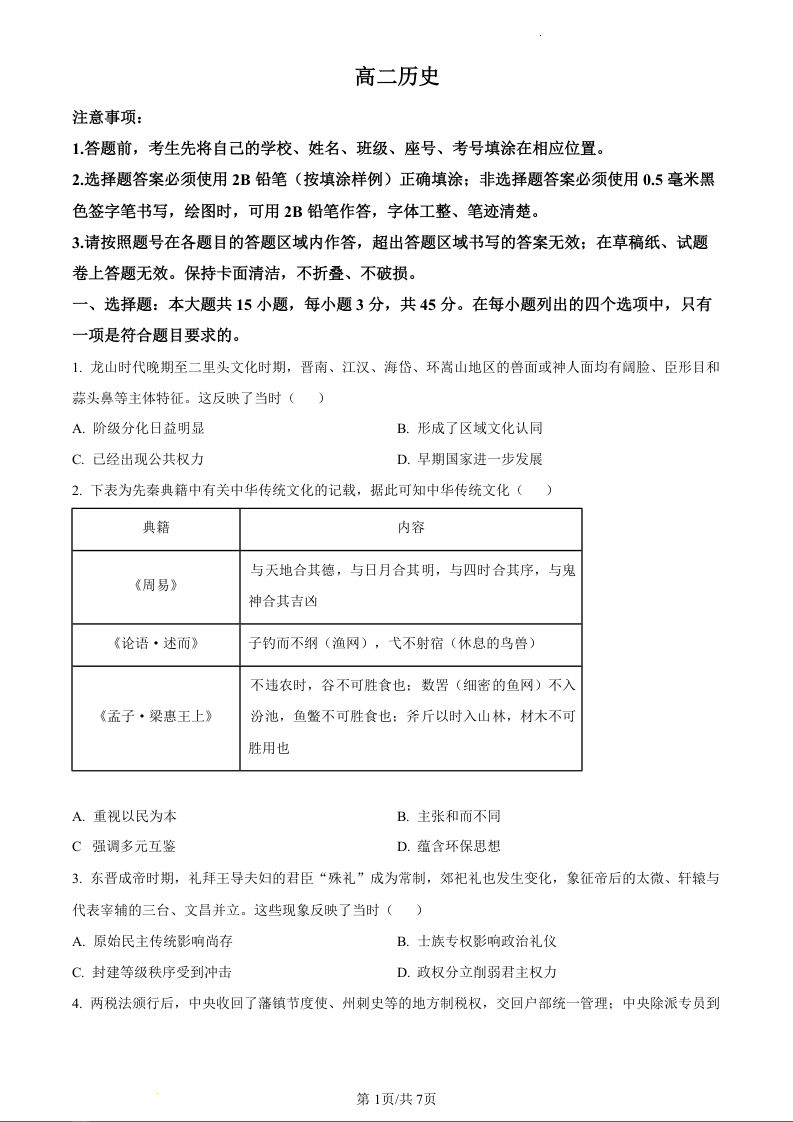 山东省潍坊市2023-2024学年高二下学期期中考试历史(原卷版)