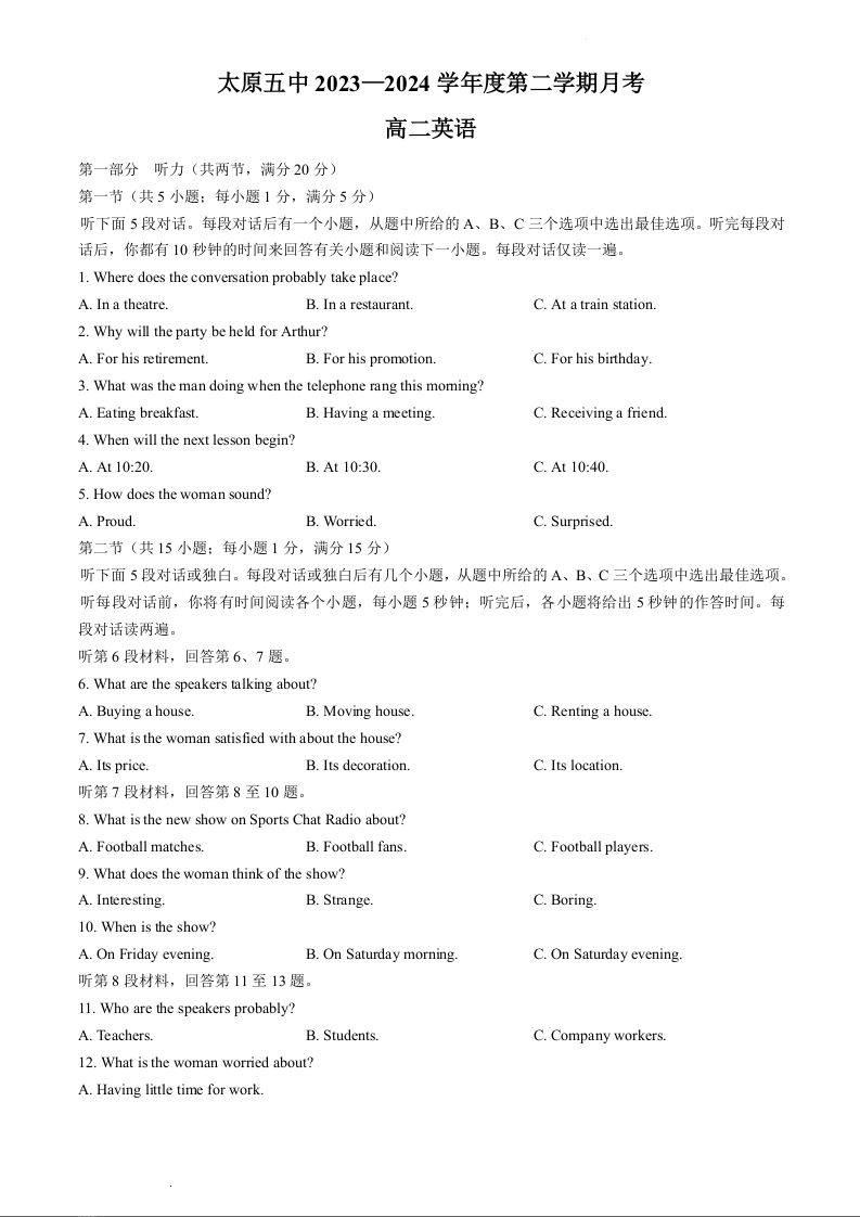 山西省太原市第五中学校2023-2024学年高二下学期5月月考英语+答案