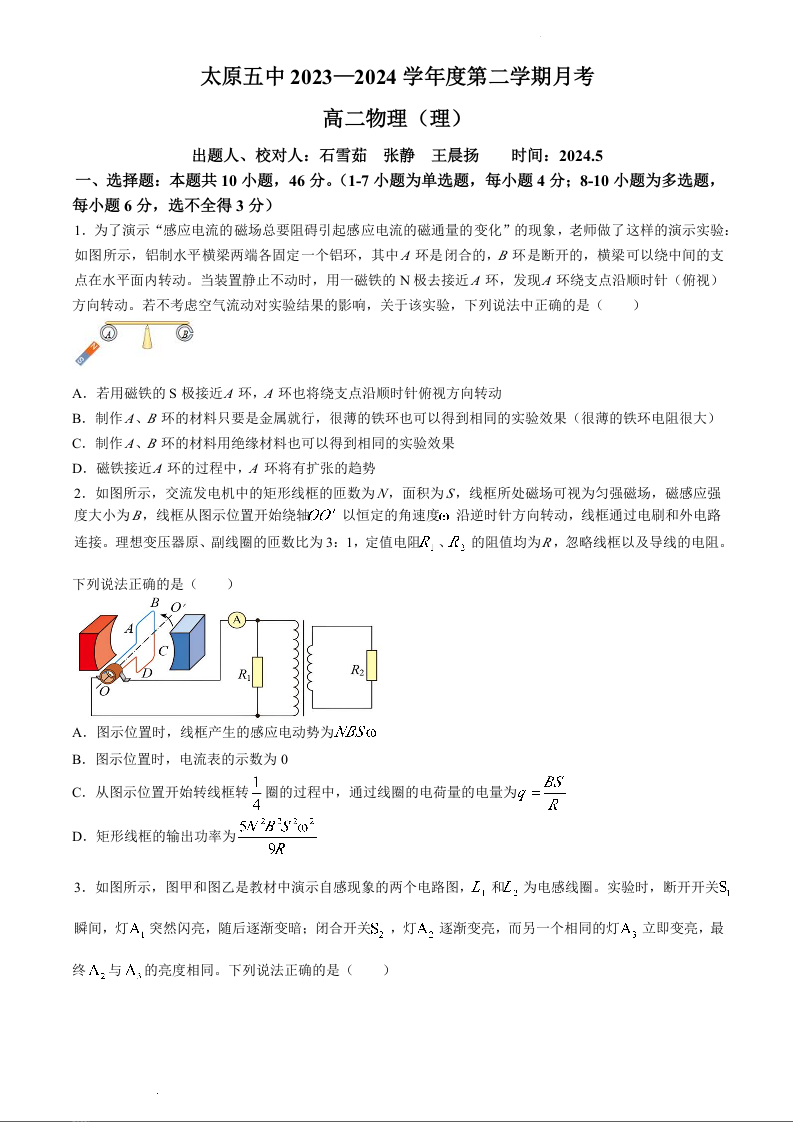 山西省太原市第五中学校2023-2024学年高二下学期5月月考物理+答案