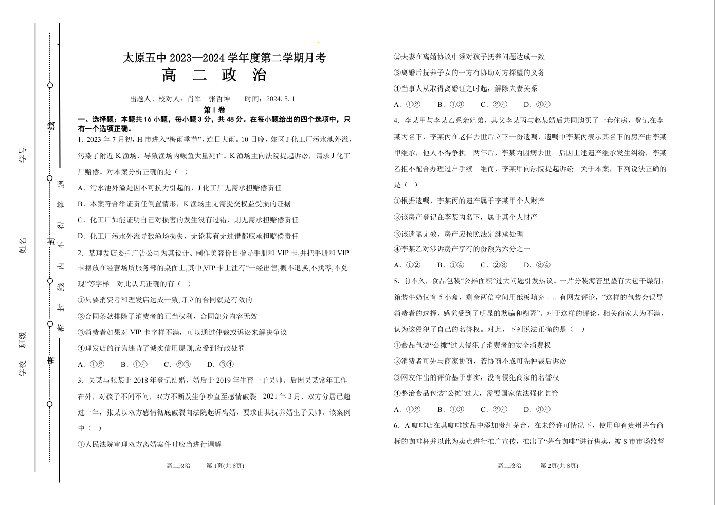 山西省太原市第五中学校2023-2024学年高二下学期5月月考政治
