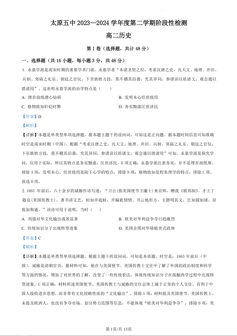山西省太原市第五中学校2023-2024学年高二下学期5月月考历史(精品解析版)