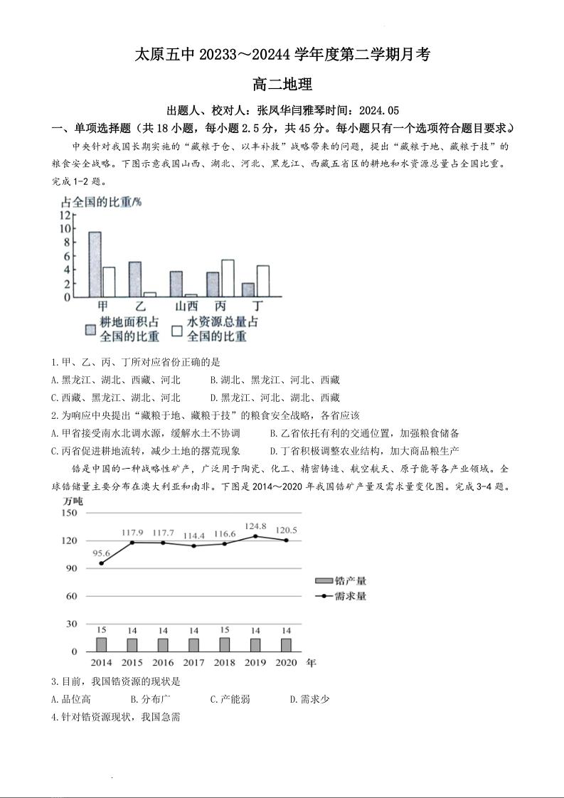 山西省太原市第五中学校2023-2024学年高二下学期5月月考地理+答案